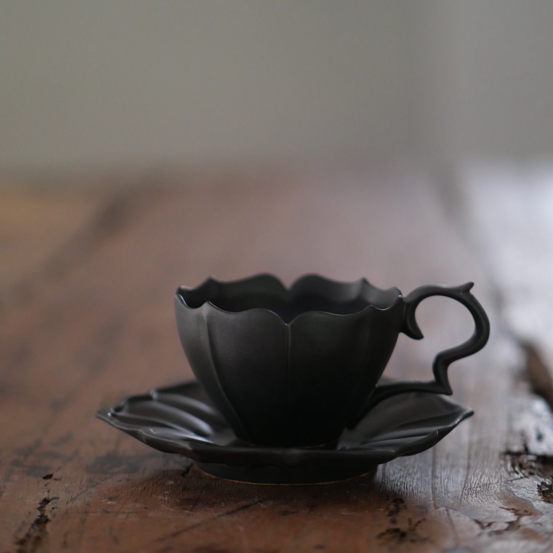 手作業で作り上げた器は、自然の造形美のようなゆらぎがあり、彫刻のような美しさのあるカップとソーサーは、テーブルに影を落とし、美しい表情を作り出します。