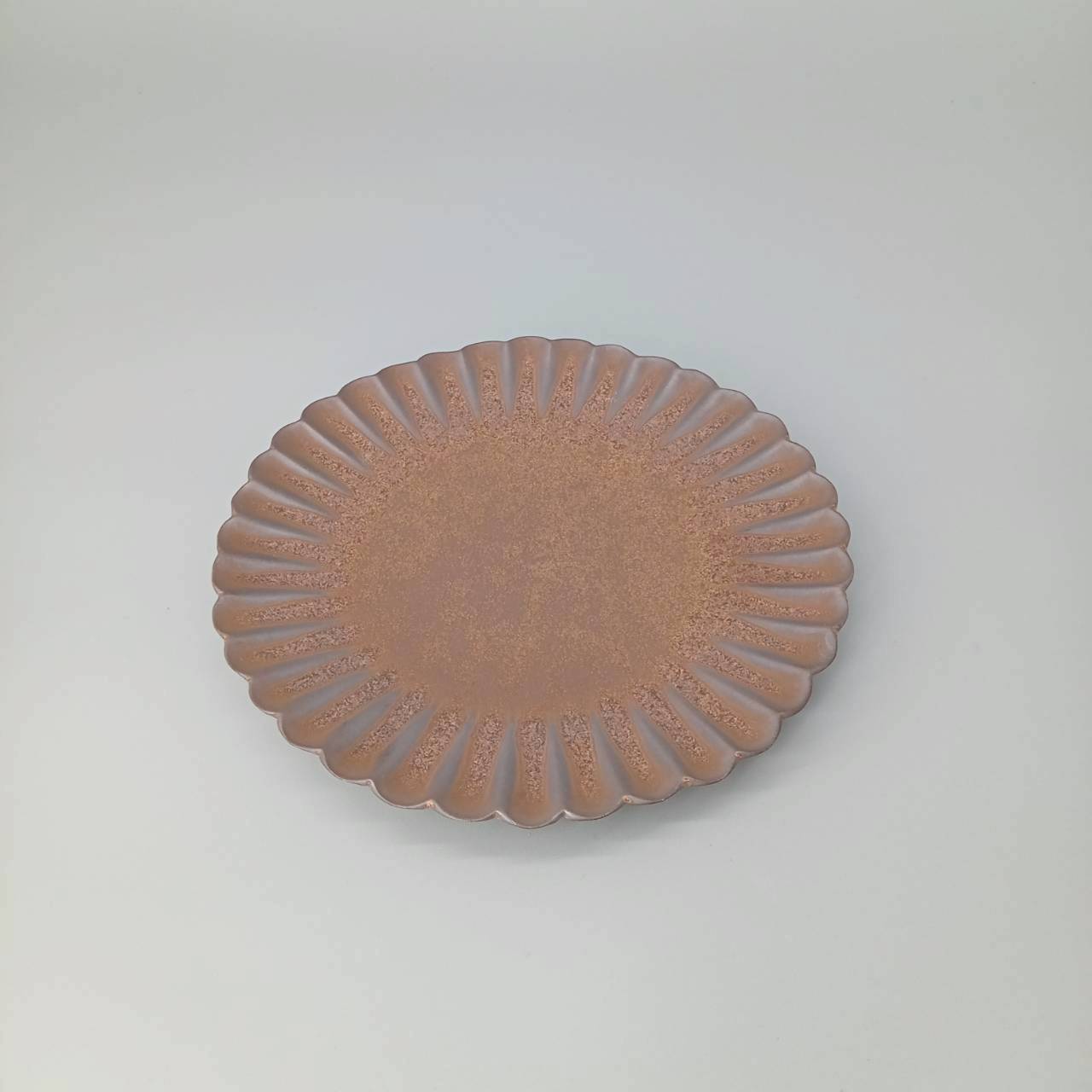 細やかな花弁が縁取るシルエットが特徴的な、平らな面があるお皿です。